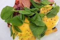 My pick: (top photo) Latke stack with poached egg - crisp Polish pancakes sandwiches with creme fraiches topped with premium ham and surrounded by pretty pickled red onion and dill.