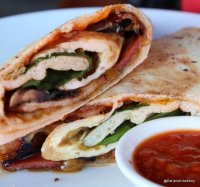 My pick - Breakast burrito - streaky bacon, three friend eggs, cheese, mushrooms, baby spinach and house-made tomato relish.