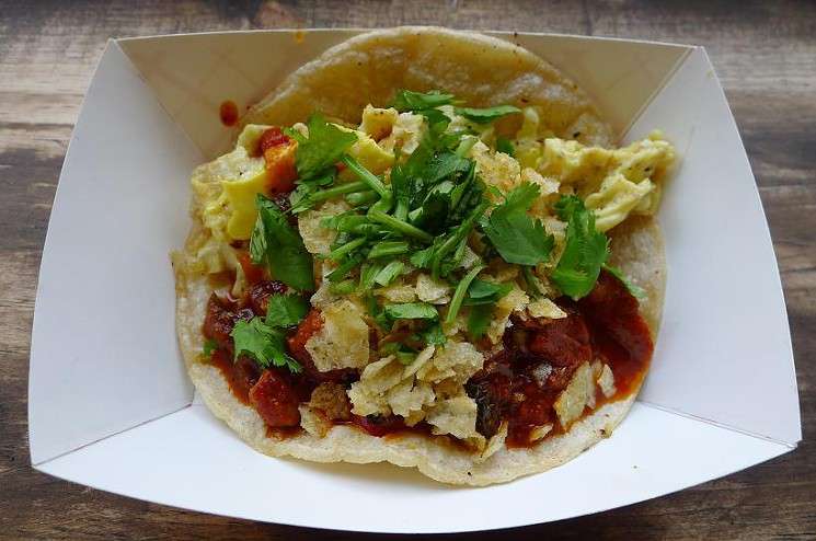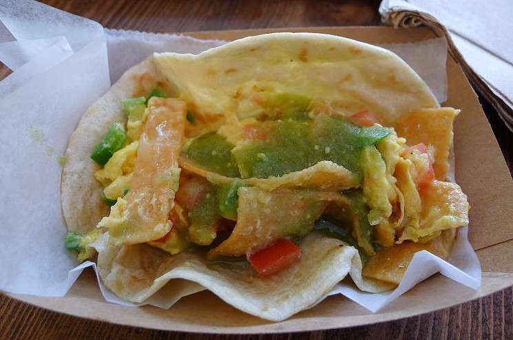 - There's really only one breakfast taco available at Whirlybird, but it's a doozy, featuring a corn tortilla, scrambled eggs, rubbery Oaxacan cheese, a homemade tomato salsa, and-odd man out-crumbled jalapeno potato chips. You can add chorizo for an additional fee. 254 South 2nd Street, Williamsburg, Brooklyn, 718-208-8555